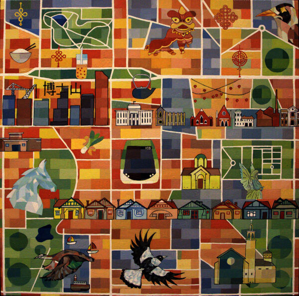 The painting portrays the essence of Box Hill, Victoria. Stepping here feels akin to wandering through the bustling restaurant laneways and malls of Shanghai or Singapore – It does not get more authentic in terms of the sights, flavours, or aromas of Asian cuisine. Equally fascinating is how other heritage icons have been preserved including the rows of Californian Bungalows, the old Art Deco Swimming Pool building, abandoned Box Hill Brickworks, Surrey Park Model Boat Club and the Box Hill Cemetery. Lastly the skyscrapers and cranes remind us how the city is racing towards establishing itself as a second CBD for Melbourne.