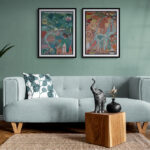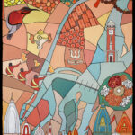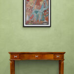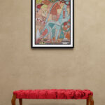 The painting captures the essence of the holy Hindu pilgrimage city of Haridwar situated on the banks of the sacred river Ganga. The iconic Har Ki Pauri Ghat takes centre stage, surrounded by vibrant temples. The artwork also portrays the age-old tradition of Ganga arti and the flower baskets that are set to adrift downstream, alongside other symbolic icons and intricate patterns to beautifully depict the spiritual vibrancy of Haridwar.